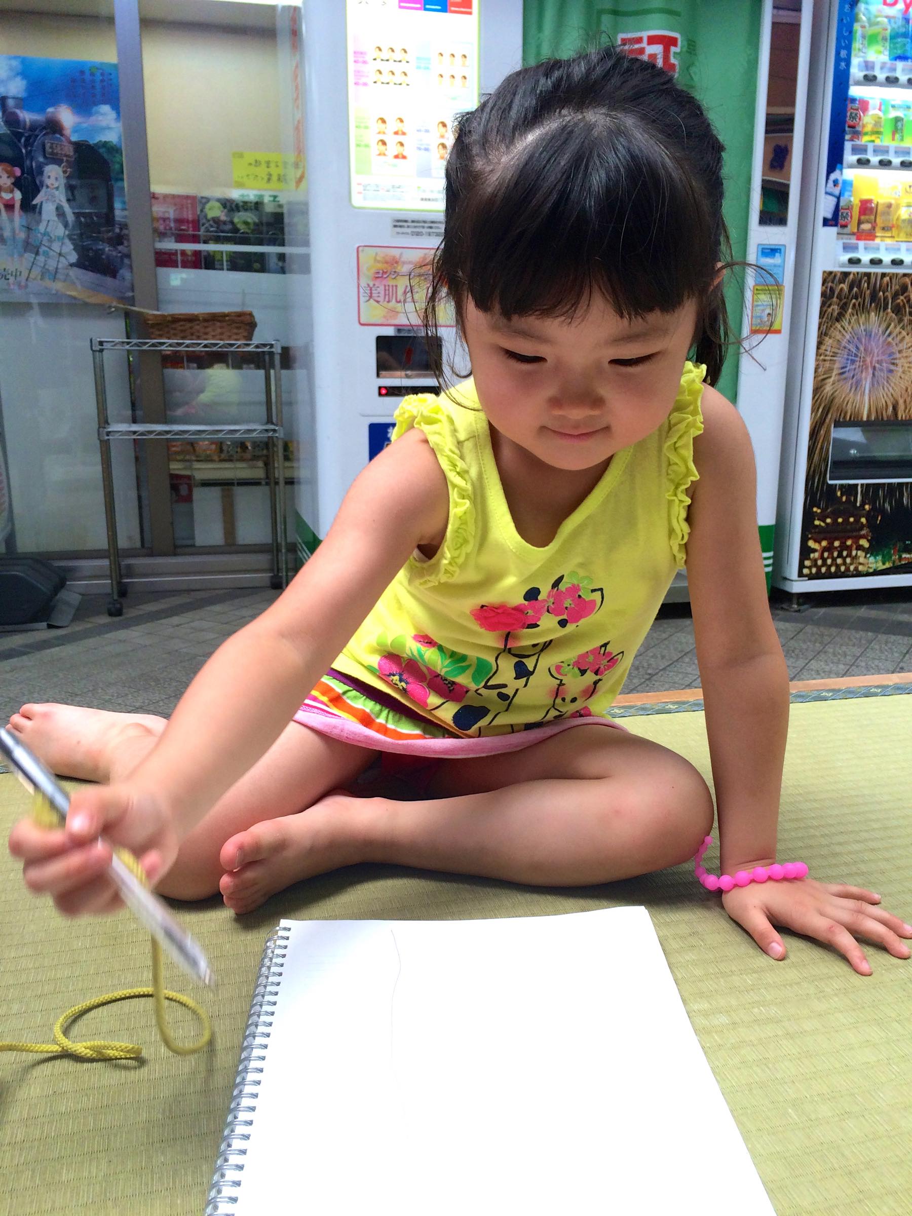 お店の前のベンチに自由に描いてもよいお絵描き帳があったので何やら一生懸命描いていました。