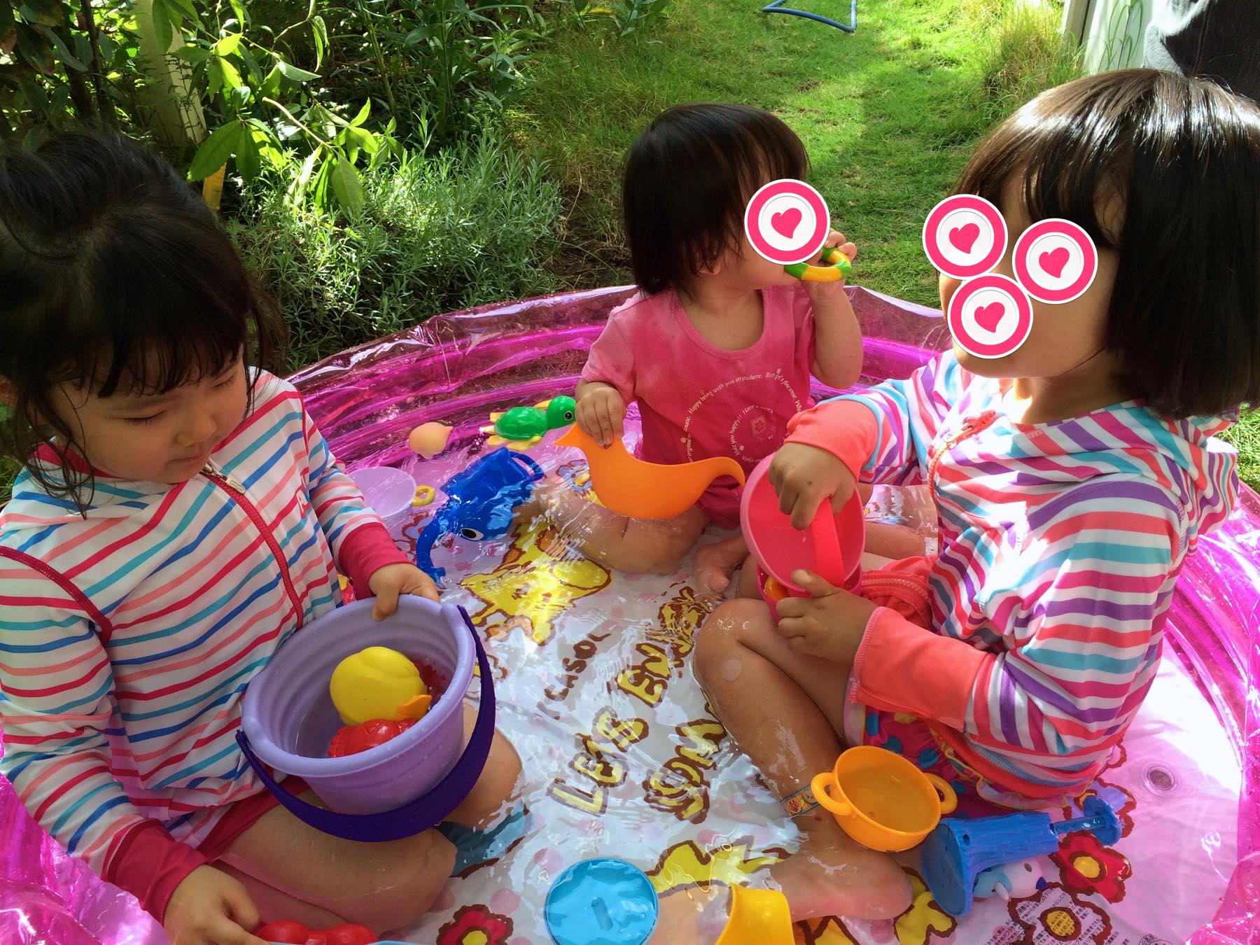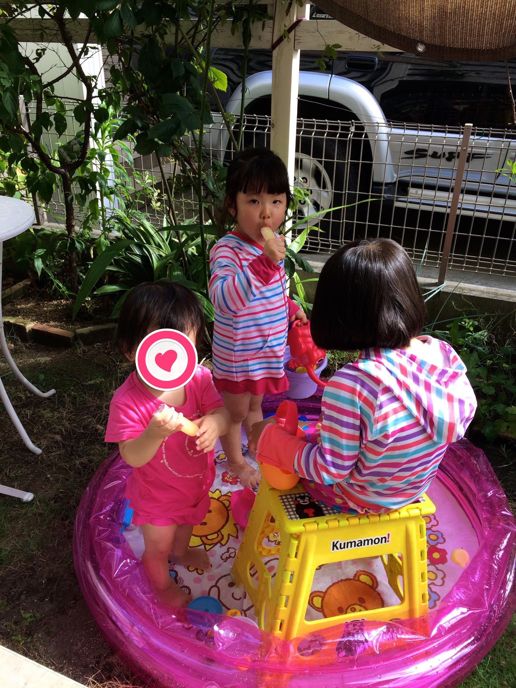 今日はお友達の家でプールをしました。とても暑い日でみんなで水遊びを楽しんでいました♪