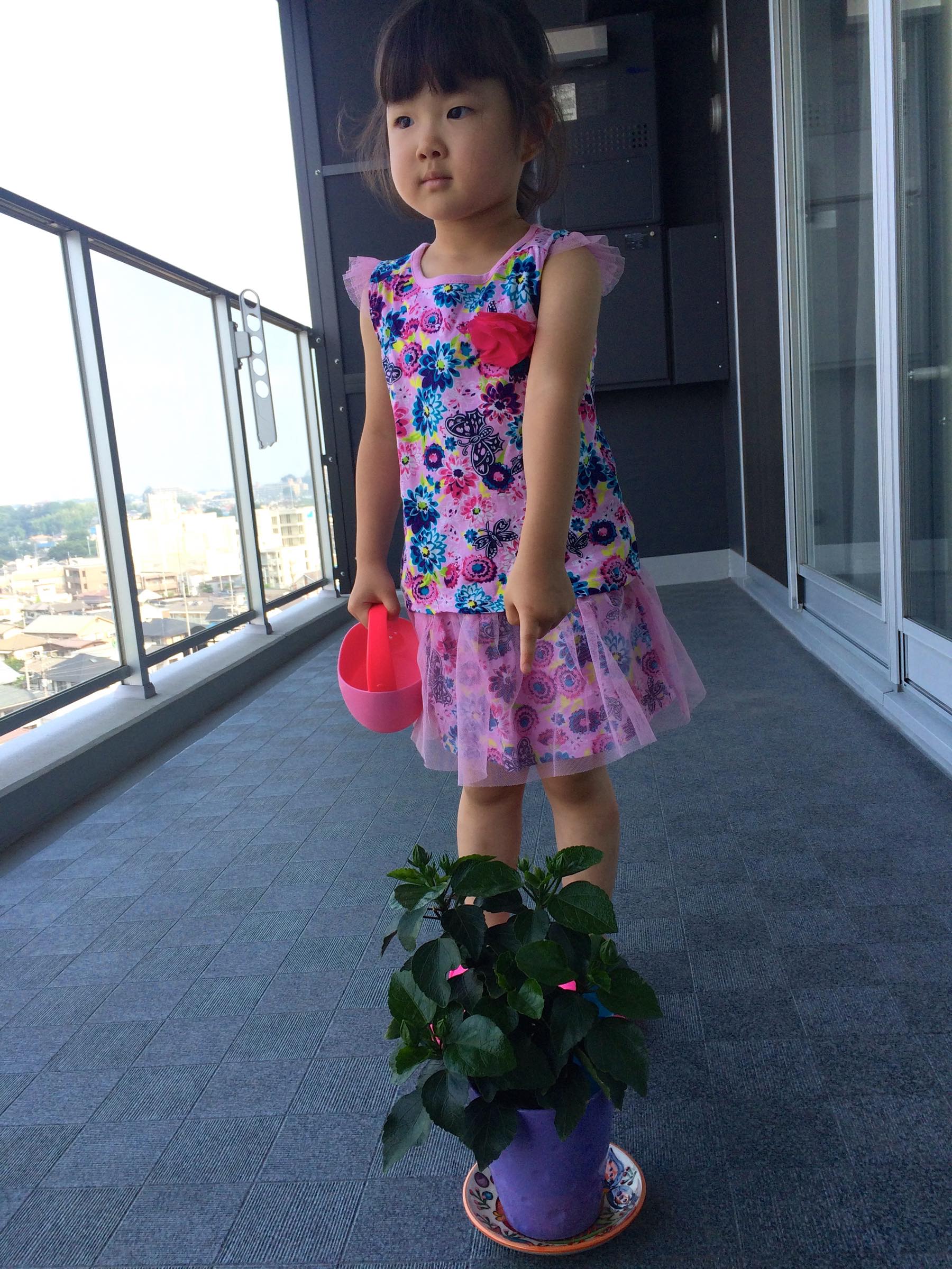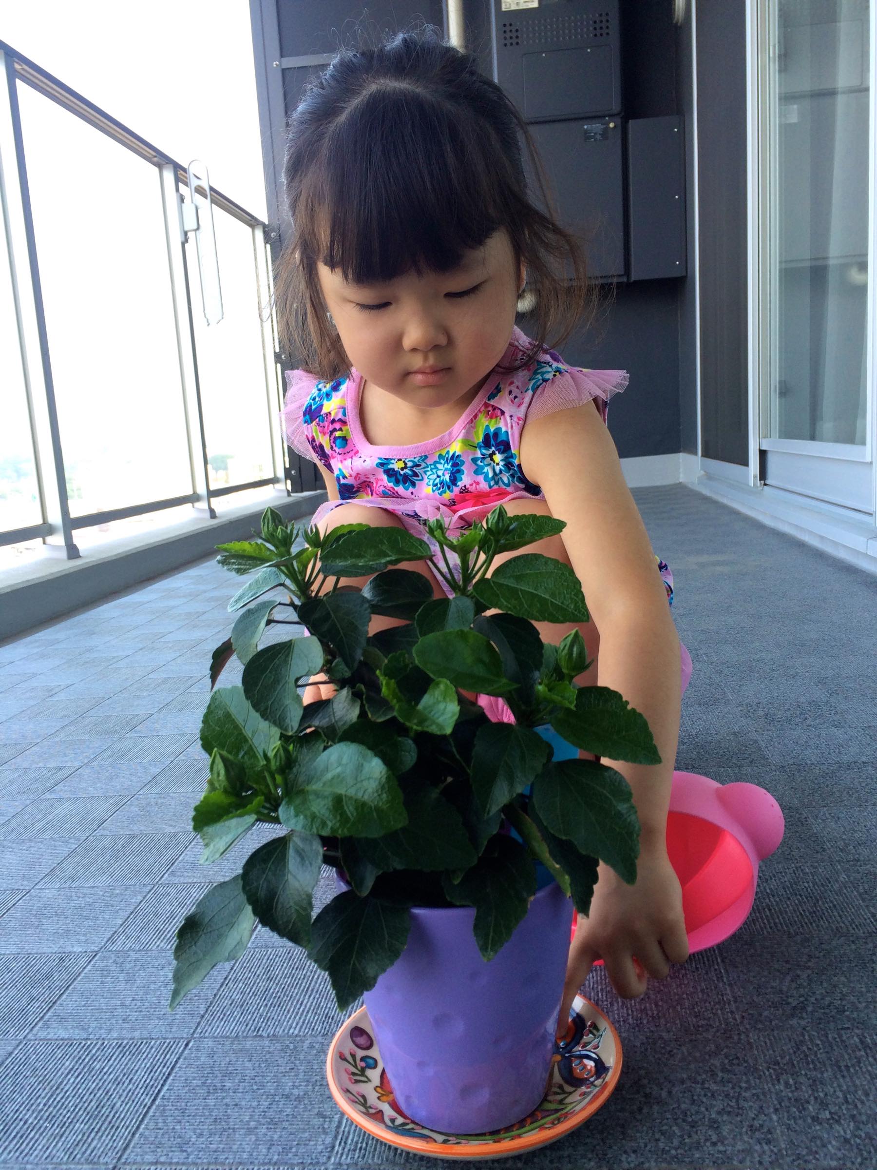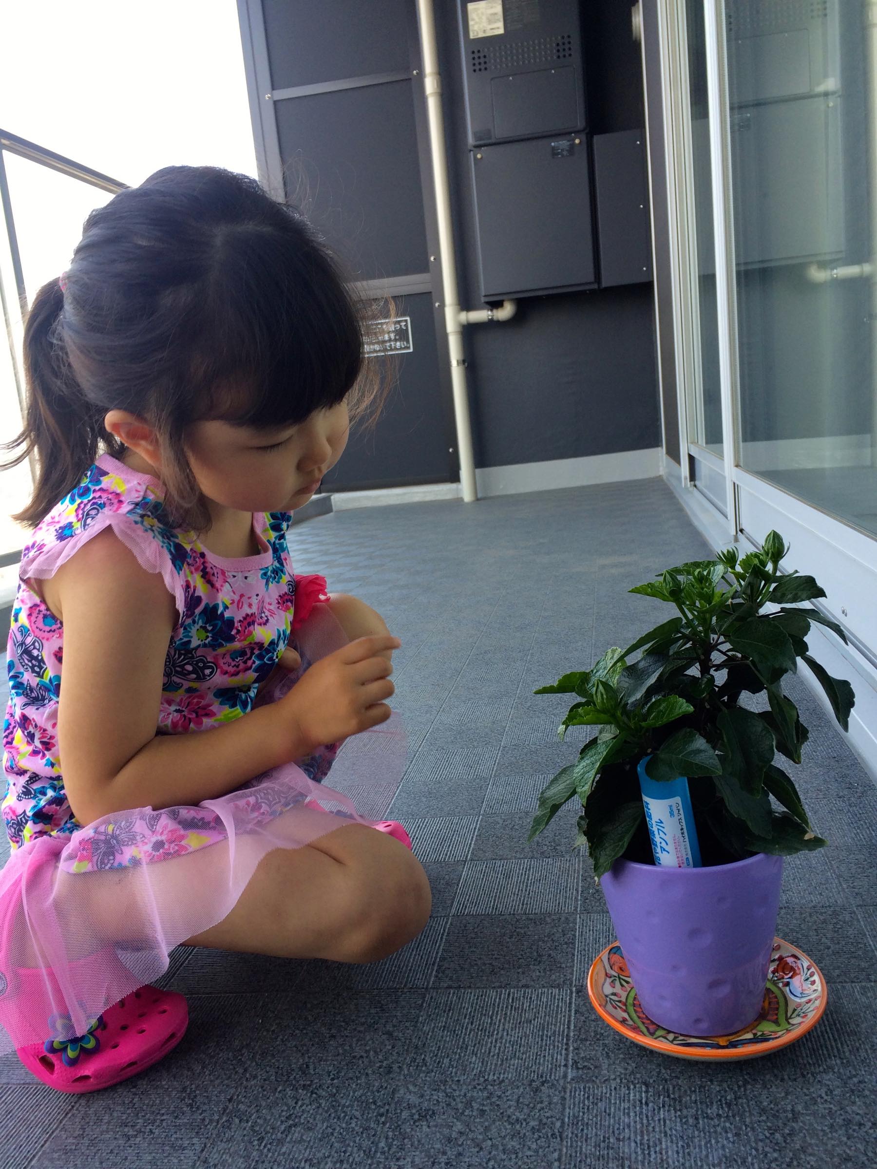 朝お水をあげる使命を与えると起きてくれるようになったよ、と同じクラスのママに教えてもらったのでこのちゃんも真似してやってみることにしました。買ってきた鉢植えはハイビスカス。つぼみがたくさんあってまだ花が咲いていないほうが長く楽しめるかと思ったら、つぼみがポロポロ落ちてしまってちゃんと咲くのか心配になってきました。