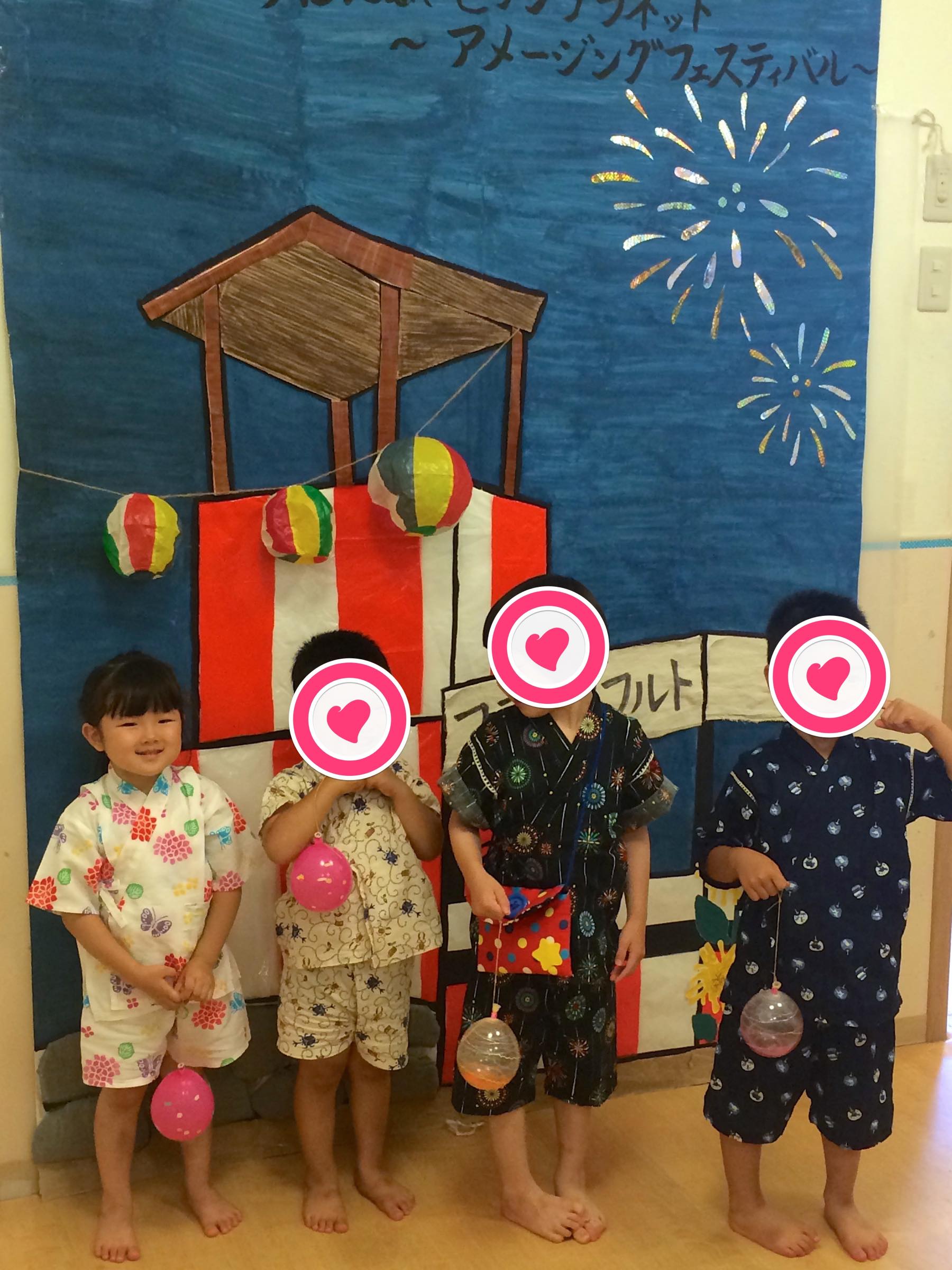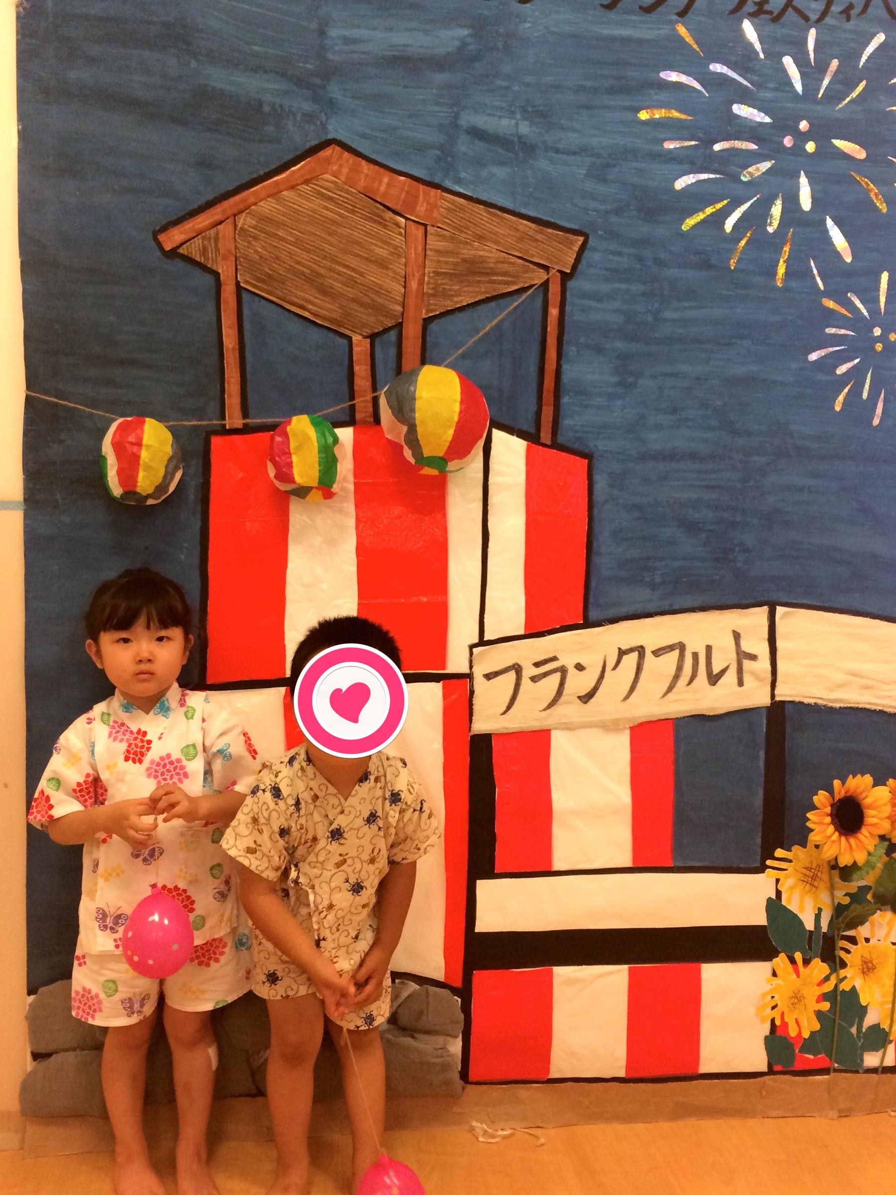 屋内の縁日では写真コーナーでクラスのお友達を写真を撮りました。