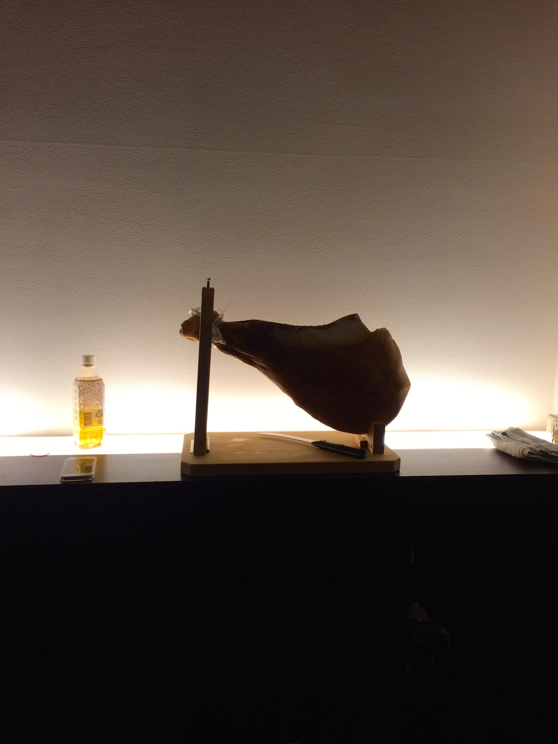 15時半から始まった会は外が暗くなってからもまだまだ続き、棚に置かれた生ハムがまるで美術館のオブジェのようで笑ってしまいました。